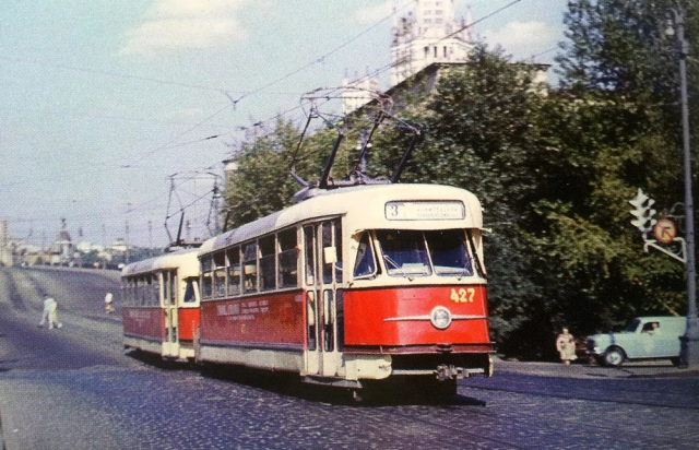 Начнём с Садовнической набережной и Комиссариатского моста. Система трамваев Татра Т2 мчится по Москве.