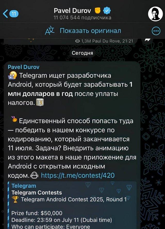 Павел Дуров и его мессенджер Telegram, ищет Android-разработчика с зарплатой в миллион долларов в год — уже после уплаты налогов. Вдумайтесь, зарплата 80 миллионов рублей в год (это еще по минимумальному курсу).