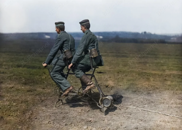 Немецкое изобретение для наполнения аэростата, путем выработки энергии с помощью переоборудованного велосипеда-тандема. Первая Мировая, 1914 год.