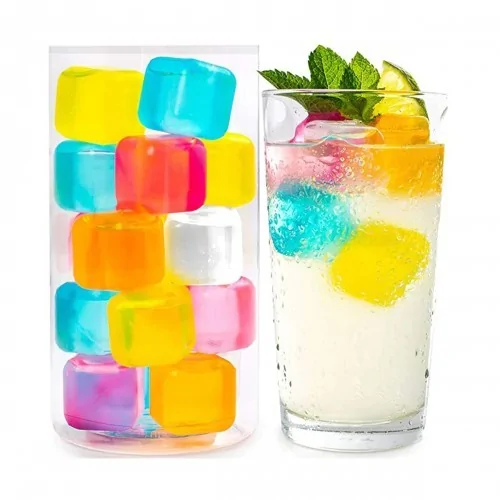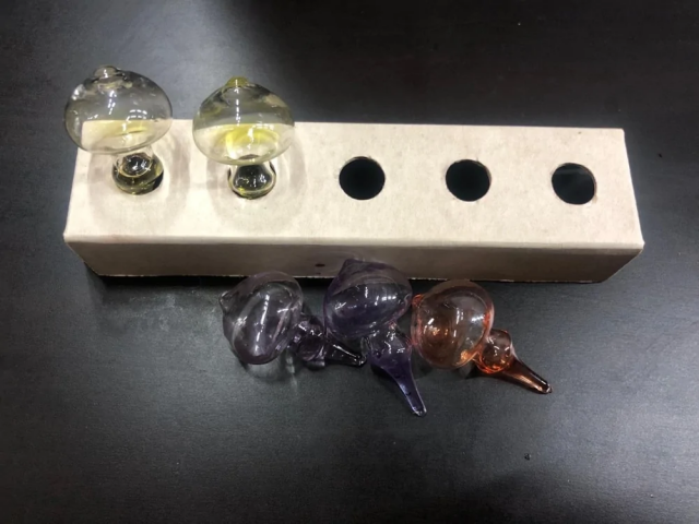 5. Стеклянные флаконы необычной формы с жёлтой, синей и оранжевой жидкостью