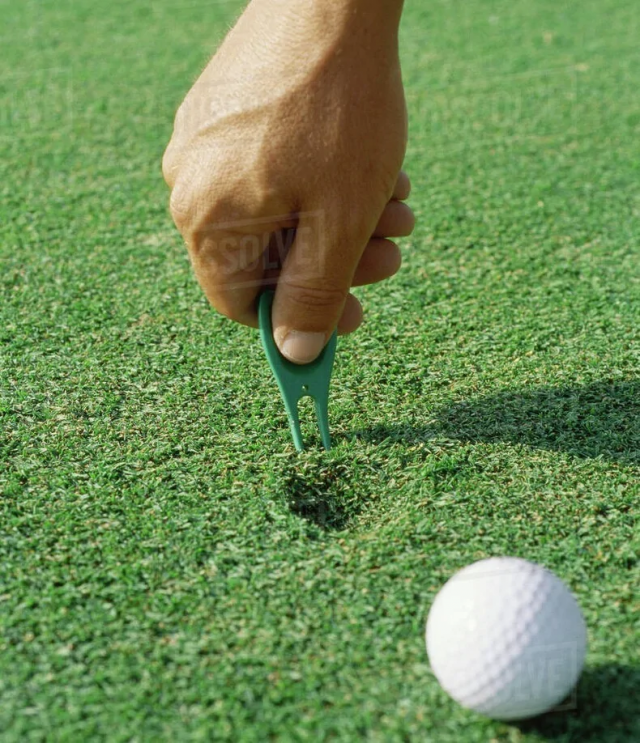 Приспособление для заделки вмятин, оставленных мячом на поле для гольфа.