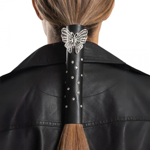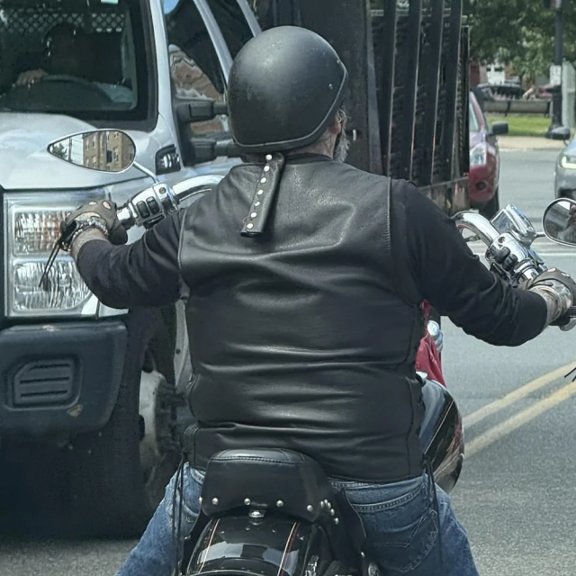 7. Кожаный чехол с заклёпками, который не закреплён на шлеме байкера