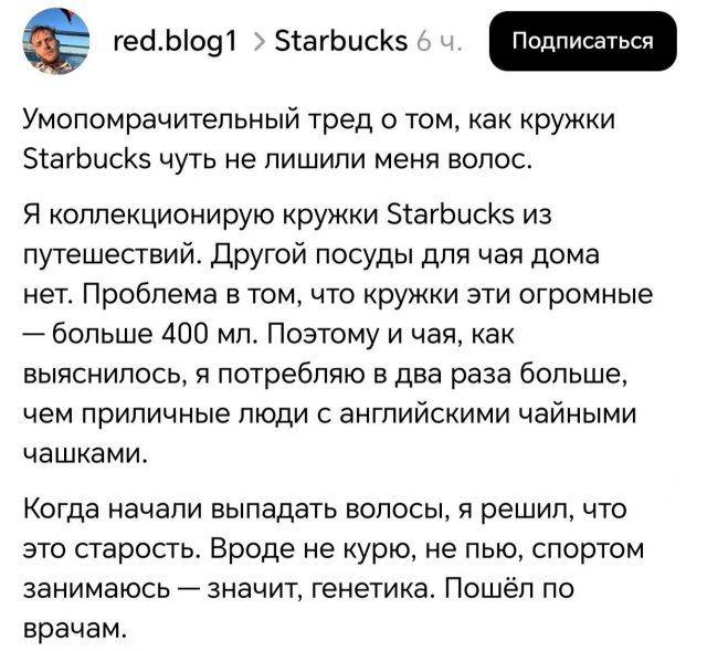 Парень начал лысеть из-за чая: он ежедневно пил по 2 литра чая в день, но потом начал замечать проблемы со здоровьем. Врачи не могли понять, что с ним: вредных привычек у него нет, а для облысения чел ещё слишком молодой.Только гастроэнтеролог понял, в чём дело — чай в огромных количествах ухудшает усвояемость железа. Теперь он пьёт только фруктовые чаи и заново отращивает волосы.
