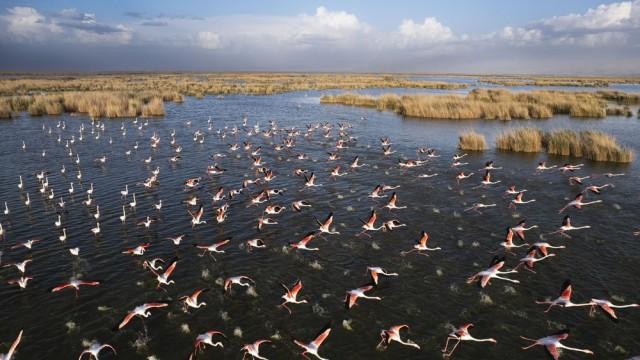 10. Вид с воздуха на Акгольские камыши, одно из важнейших водно-болотных угодий Турции в районе Эрегли города Конья, где обитают анатолийские фламинго, Турция, 25 мая 2025 года. Акгольские камыши, известные как птичий рай Коньи, — одно из мест, часто посещаемых любителями фотографии и природы. (Фото Энгина Айылдыза/Anadolu via Getty Images)