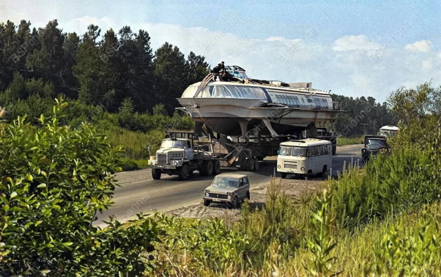Транспортировка теплохода «Метеор-172» в город Иркутск с верфи в городе Зеленодольск. В качестве тягача используется японский лесовоз Komatsu-Nissan KNWF 12T, 1983 год.