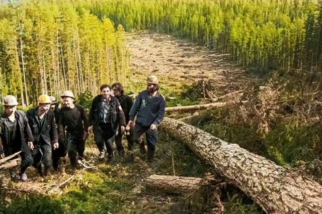 Бригада Виктора Лакомова во время расчистки просеки под земляное полотно участка Байкало-Амурской магистрали, 1974 год.