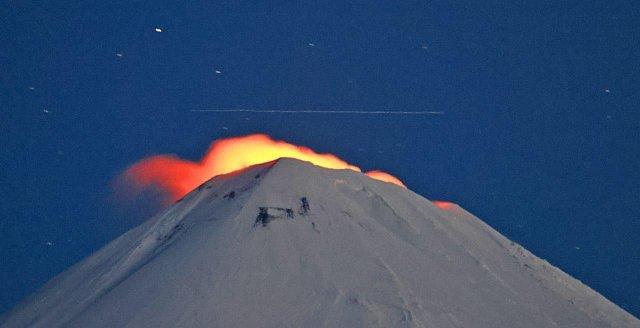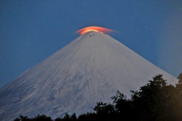 Над Ключевской сопкой на Камчатке зависло редкое лентикулярное облако, которое подсветило огненным светом лавы. Удивительное и редкое и зрелище!