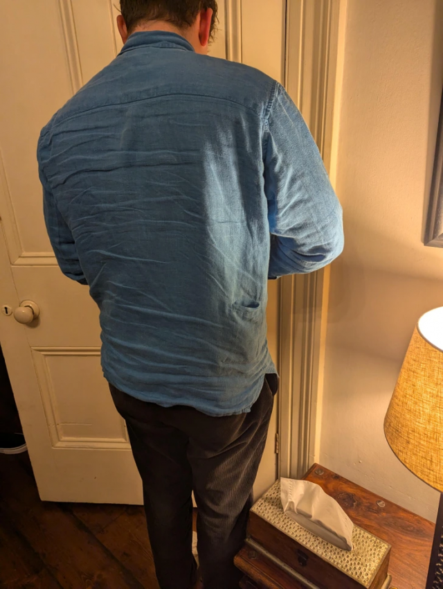 А это специальный элемент на импортных рубашках. Чтобы они классифицировались как особый предмет одежды, не облагаемый пошлиной.