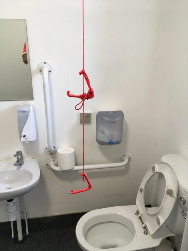 «Красный шнур с ручками, свисающий с потолка туалета на заправке»