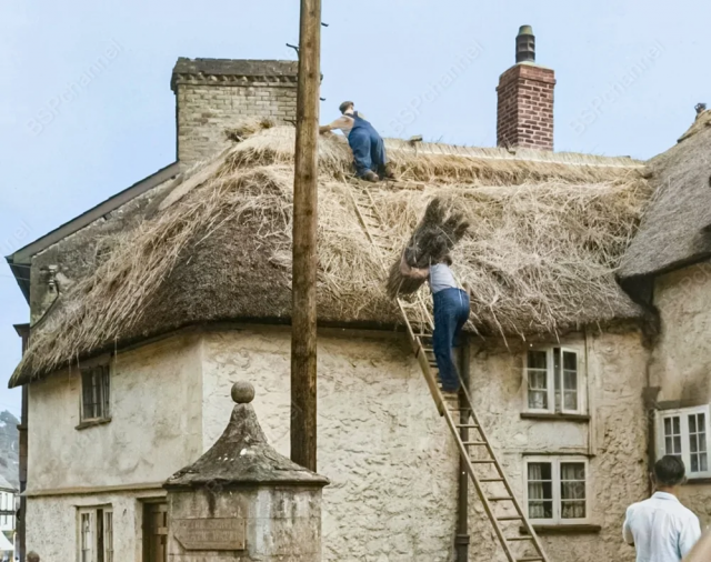 Рабочие кладут соломенную кровлю. Девон, Англия, 1959 год.