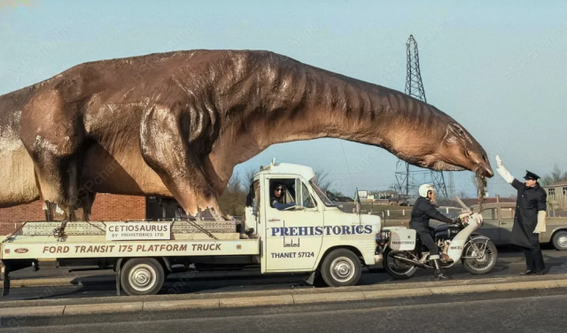 Скульптура динозавра едет в Доисторический парк. Шотландия, 1973 год.
