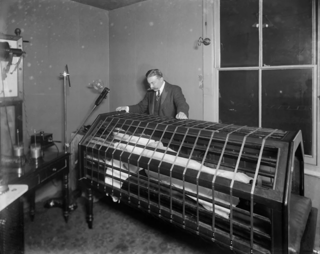 Это спорное медицинское устройство начала 20 века применяли для электрошоковой терапии пациентов в психиатрических клиниках. Считалось, что токи вызывают судороги и оказывают положительное терапевтическое воздействие.