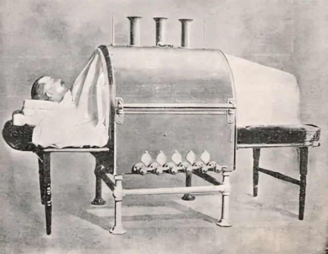 Аппарат Таллермана–Шеффилда, известный также как "печь для человека", был изобретён в XIX веке для лечения боли с помощью горячего воздуха. Процедура "запекания" напоминала сауну и применялась для облегчения симптомов подагры, артрита и других недугов.