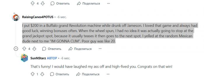 Похожую историю с джекпотом рассказал пользователь с Reddit. Выпив изрядное количество Jameson, он решил поставить $200 на слот Buffalo Grand Revolution. Он обожал эту игру, и часто выигрывал бонусы. Но когда барабаны остановились, мужчина понятия не имел, потому что ждал следующий спин — а получил Grand джекпот. Счастливчик от радости закричал «Я кончаю!», чем изрядно напугал играющего рядом незнакомца.