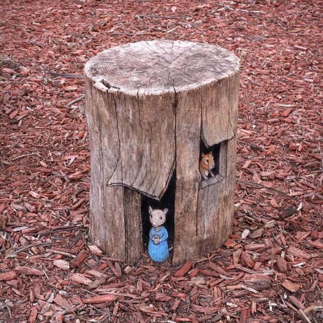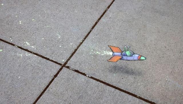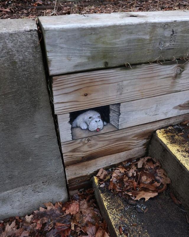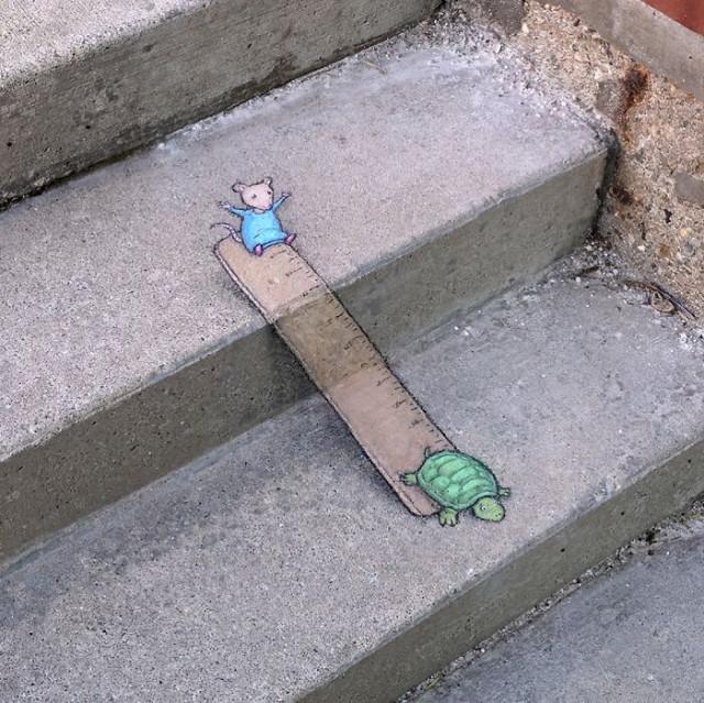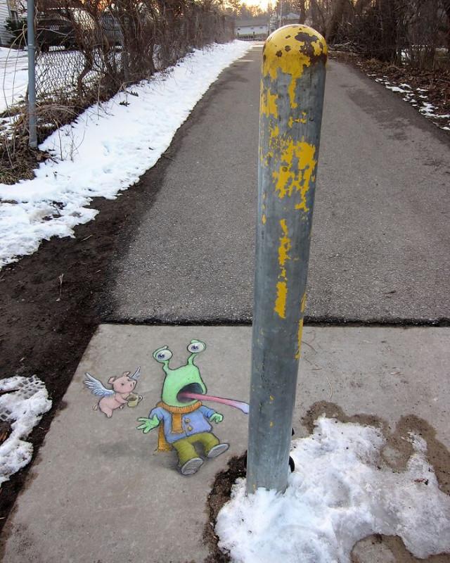 Художник из Мичигана Дэвид Зинн (David Zinn) рисует мелом прямо на улицах, превращая трещины, пятна и бордюры в волшебные сцены с весёлыми существами. Его работы живут недолго — дождь смывает их, оставляя после себя лишь улыбки прохожих.