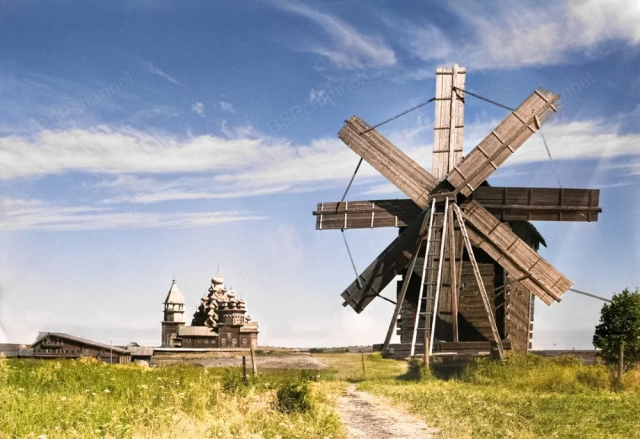Ветряная мельница крестьянина Биканина из деревни Волкостров. Государственный историко-архитектурный и этнографический музей-заповедник "Кижи", Карельская АССР, 1966 год.