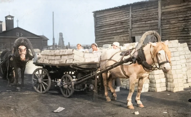 Идет погрузка соли для отправки на фронт. Фасовочная мастерская Союзсольсбыта в Усолье-Сибирском. Иркутская область, 1941 год.