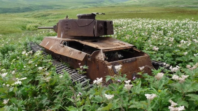 Советский танк времён Второй мировой войны на острове Шумшу в составе северной группы Курильских островов