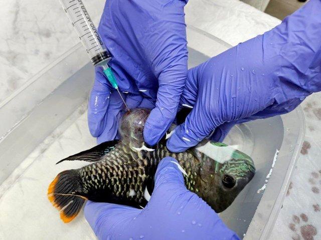В Зеленоградской ветклинике впервые оказали помощь...рыбке. У бирюзовой акары на брюшке начало расти образование, которое мешало рыбке плавать. Врачи сделали УЗИ, диагностировали кисту и удалили её содержимое. Сейчас рыбов нормально плавает и снова стала активной.