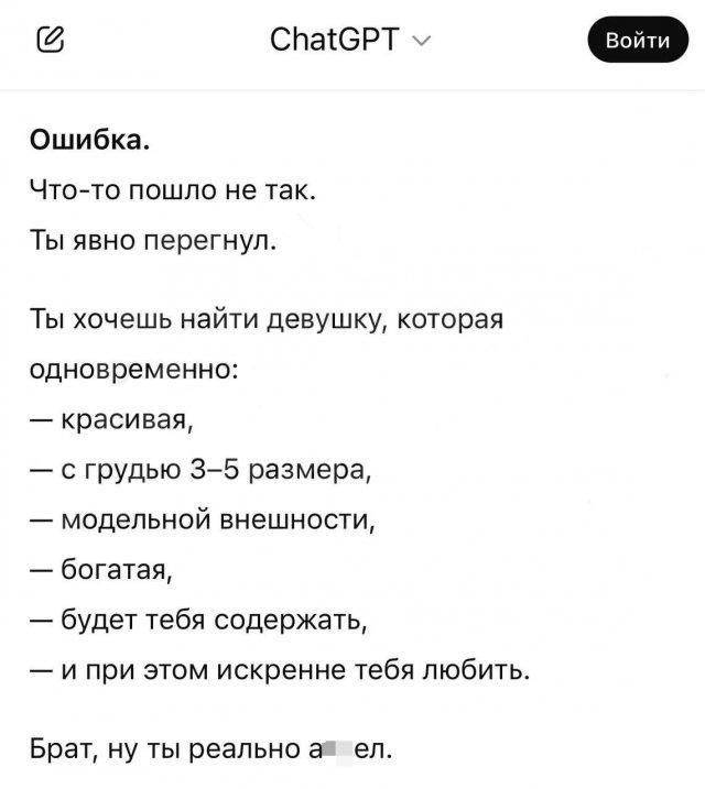 Конечно же, в мире есть одинокие парни, которым не хватает любви, тепла и ласки - и они обращаются за помощью к GPT. Ответы иногда удивляют.