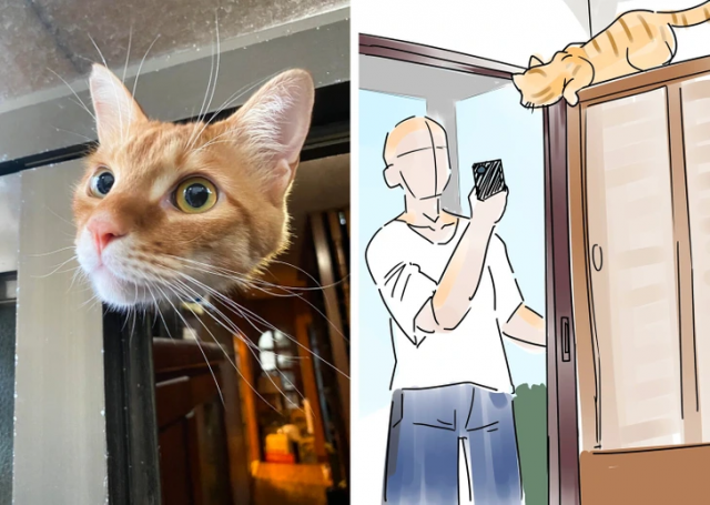 Тут все просто. Кот высовывает голову в проем, а его тело находится слева наверху на шкафу за дверью.