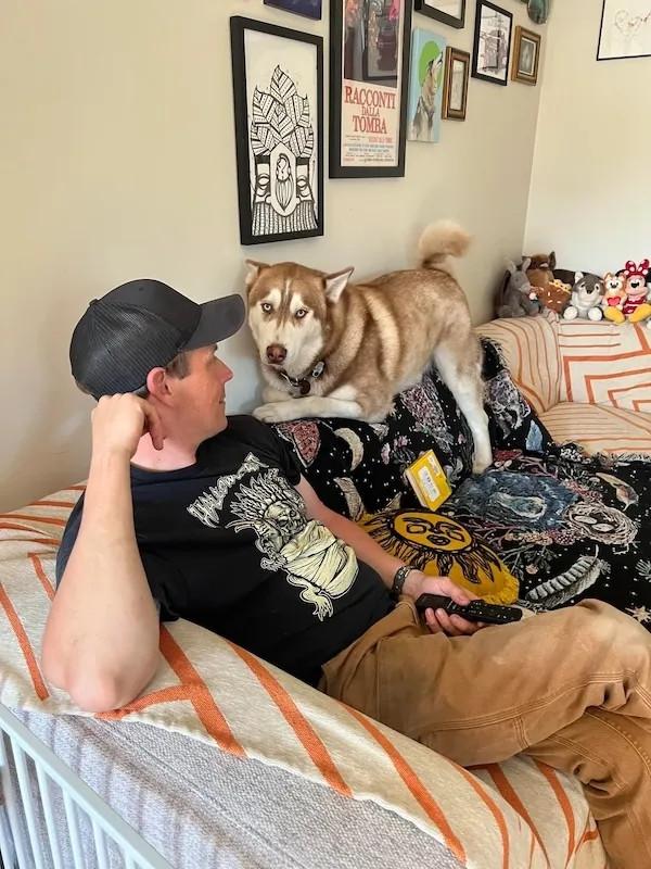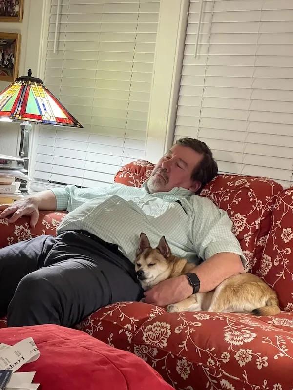 5. «Мой муж больше любит кошек, и был не в восторге от появления у нас щенка Хэнка. Поначалу у него было правило «собакам на диване не место», но, думаю, теперь он передумал».