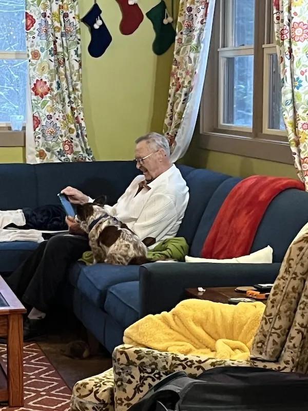 14. «Мой 81-летний отец и собака, которую он не хотел. 9 с половиной лет назад он жаловался, когда мама принесла домой щенка. Здесь он показывает собаке видеоролики на своём телефоне и объясняет, что на них происходит»