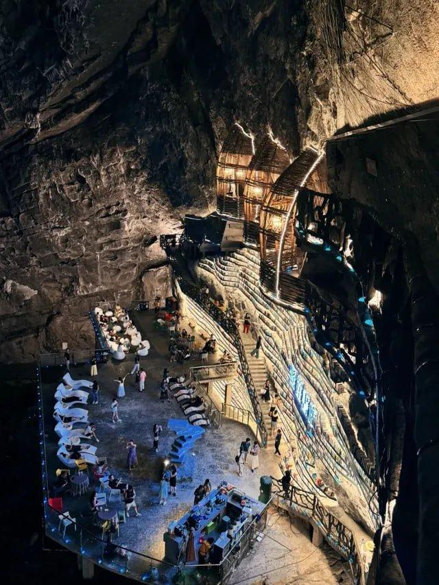 В Китае открыли книжный магазин прямо в скале возрастом около 100 миллионов лет. Он заработал в мае 2025 года и уже стал новой фишкой провинции Гуанси: полки закрепили прямо на каменной стене, добавили мягкую подсветку, лаунж-зоны и кофейню с видом на пропасть.