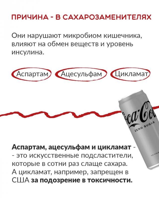 Cola Zero опаснее обычной! Выяснилось, что кола без сахара повышает риск диабета на 40%. При этом у колы с сахаром этот показатель составляет всего 23%. Дело в том, что туда добавляют сахарозаменители аспартам, ацесульфам и цикламат. Эти вещества нарушают микробиом кишечника, влияют на обмен веществ и повышают уровень инсулина.