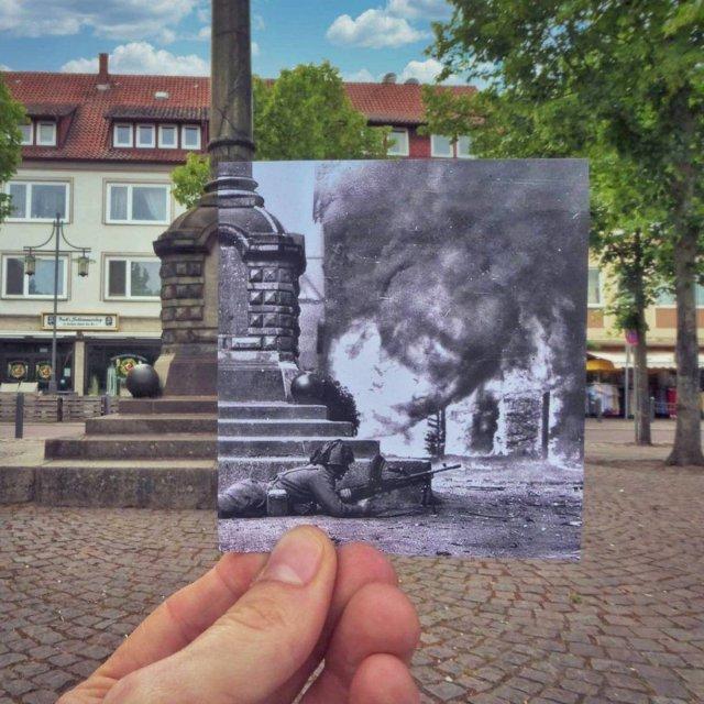 Городская площадь в Ильцене, Германия, апрель 1945 года и сейчас.