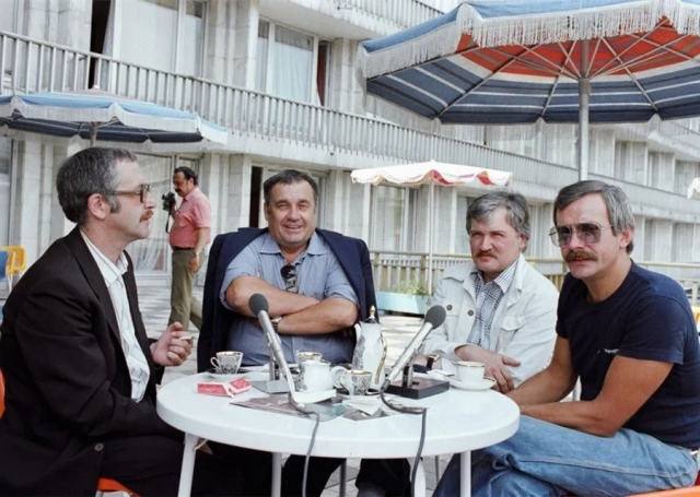 Василий Ливанов, Эльдар Рязанов, Игорь Масленников и Никита Михалков перед гостиницей "Россия"