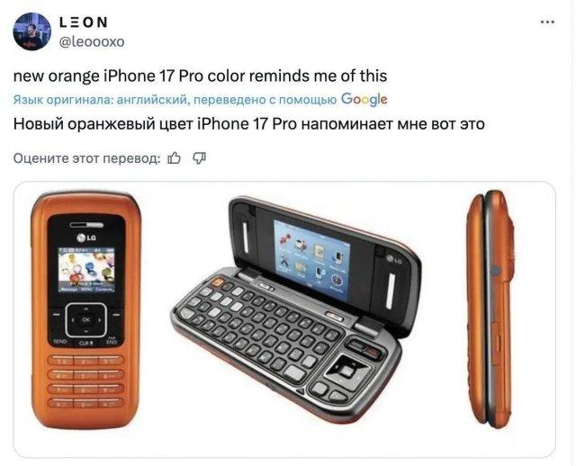 На прошлой неделе показали новый iPhone 17. Пользователи, как обычно, обсуждают спорный дизайн смартфонов, новую модель — тонкий iPhone Air, шнурок для смарфтона за $79, а также новый цвет — оранжевый. Только лучшие шутки и мемы.