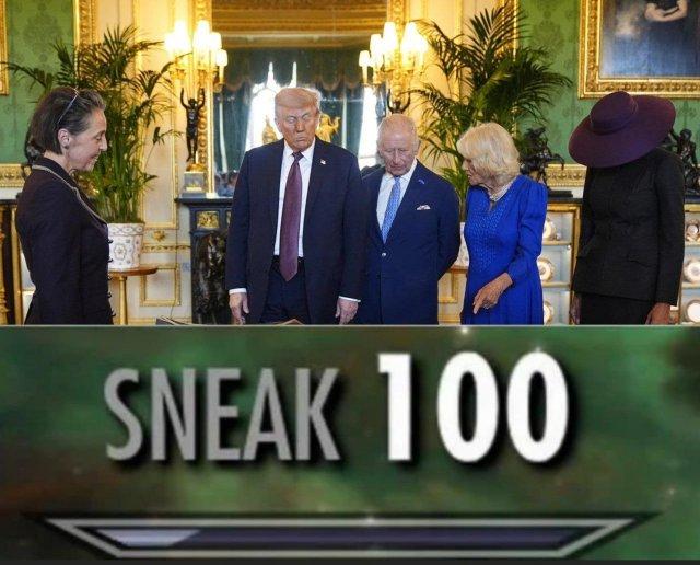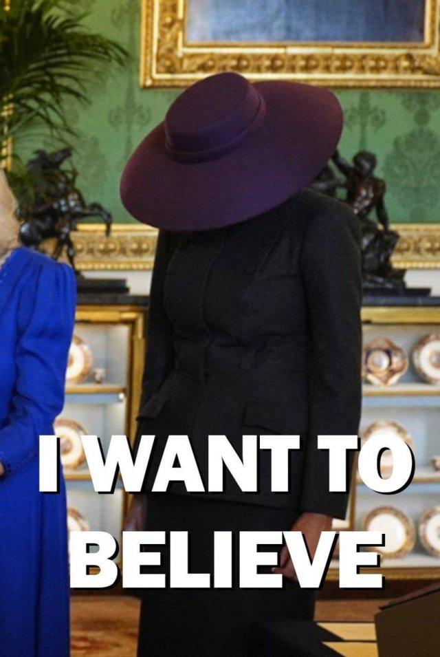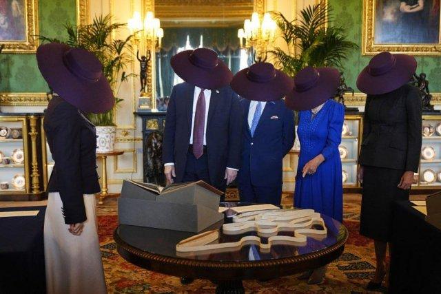 В Интернете новый мем: давеча Дональд Трамп прилетел к королю Великобритании Карлу III, но больше всего вопросов вызвал супер странный наряд его жены — Мелании. На встрече супруга президента США была в чёрном костюме и в большой фиолетовой шляпе, за которой пыталась спрятать лицо. Вокруг этого сразу же появилось множество мемов и шедевров фотошопа.
