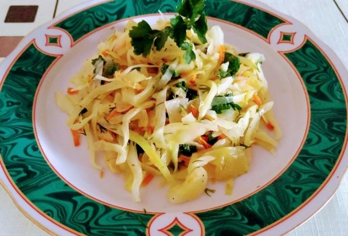 Если хочется чего-то легкого и свежего, приготовьте салат из белокочанной капусты, яблок и моркови. Капусту нашинкуйте мелко, морковь натрите на крупной терке, яблоки нарежьте соломкой. Заправьте лимонным соком, оливковым маслом, солью и щепоткой сахара. Такой салат богат витаминами и прекрасно подходит для весеннего и летнего меню, хорошо сочетается с мясными блюдами или рыбными стейками.
