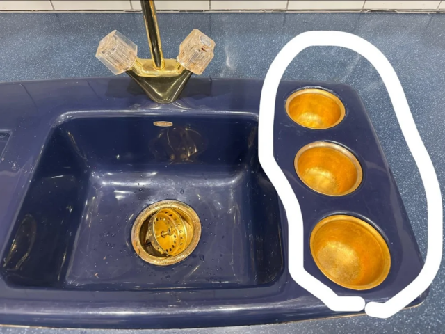2. Раковина в доме 1970-х годов с дополнительной секцией с тремя маленькими съёмными латунными чашечками