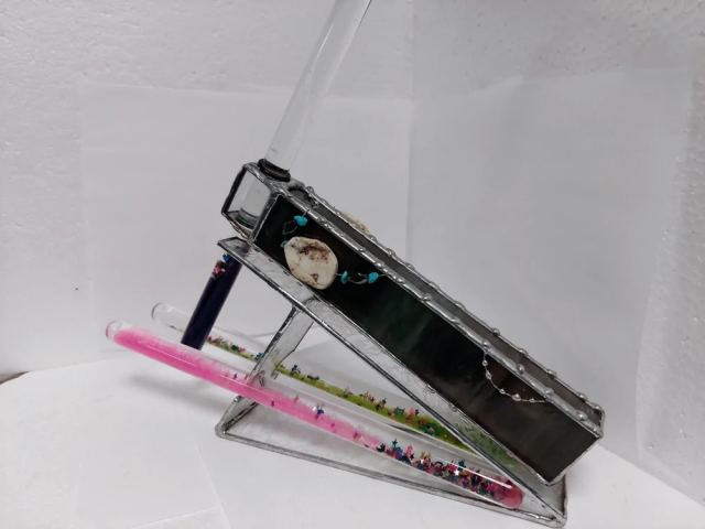 8. Конструкция с колбами, заполненными густой прозрачной жидкостью и мелкими разноцветными блестящими элементами