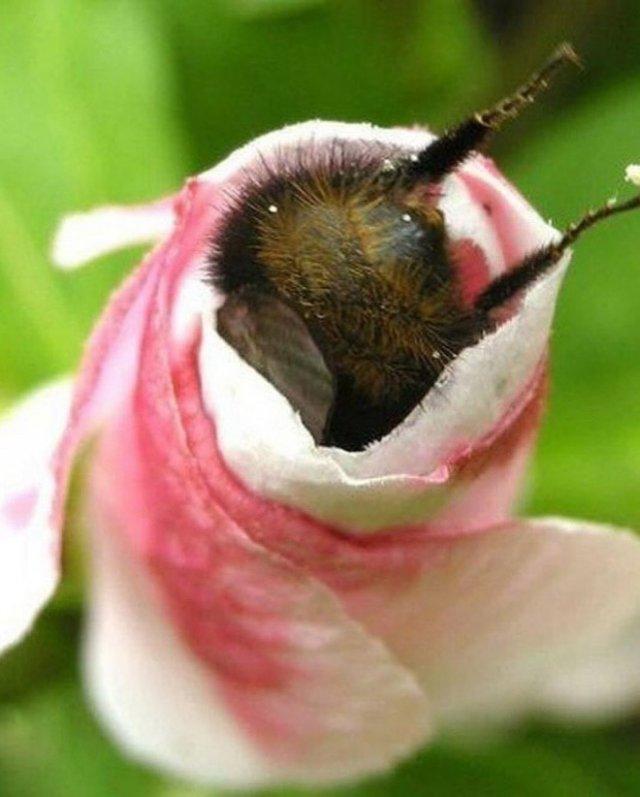 Честных работяг привыкли называть пчелками. Эти насекомые действительно поражают своим трудолюбием и организованностью. Но это сравнение не ко всем подходит. Некоторые из нас... скорее похожи на шмелей. Давайте посмотрим, как пушистые и уставшие толстячки спят после сбора нектара. Они отрубаются прямо в цветке, оставив торчать пушистую жопку снаружи.