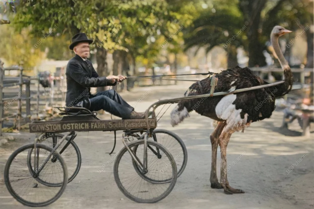 13. Страус тянет повозку на страусиной ферме Коустон в Южной Пасадене, Калифорния, около 1915 года.