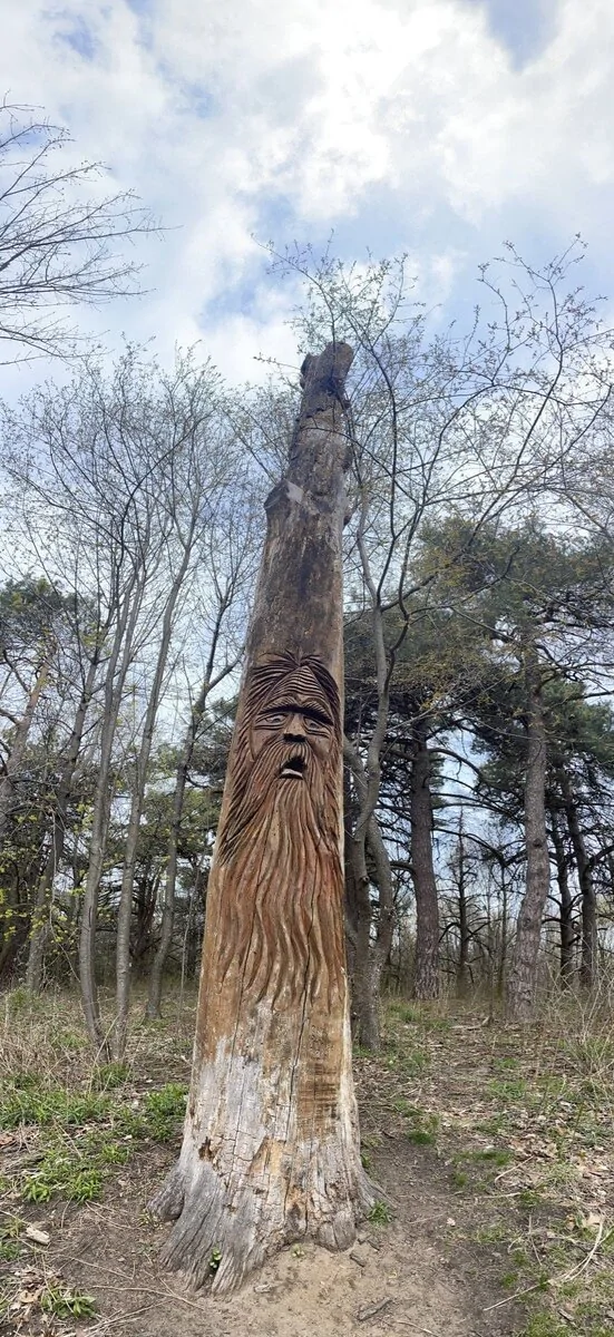 Кто-то решил вырезать лицо человека на высохшем дереве в лесу
