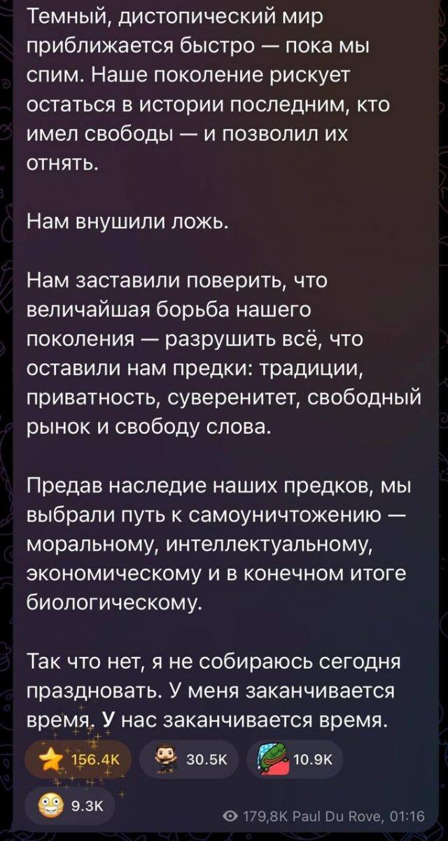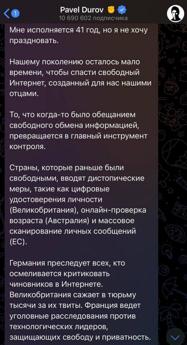 В свой 41-й день рождения Павел Дуров опубликовал апокалиптический пост о тотальной слежке и конце свободного интернета. Он сообщил, что не собирается праздновать, потому что «у нас заканчивается время, чтобы спасти свободный интернет».