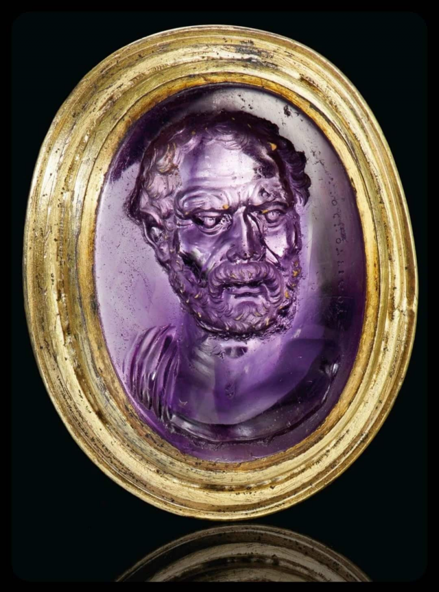 Аметистовая инталия из Древнего Рима, ~25 год до нашей эры. Перстень высотой 2 см украшен выгравированным портретом греческого оратора Демосфена.
