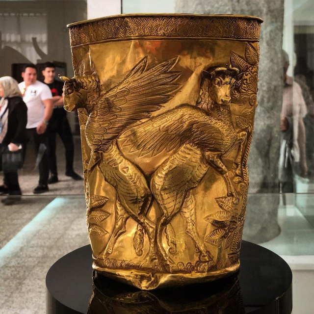 Кубок 1400 года до нашей эры. Изображает четырёх мифических крылатых быков в динамичных позах с расправленными крыльями. Обнаружен в деревне Марлик на севере Ирана.