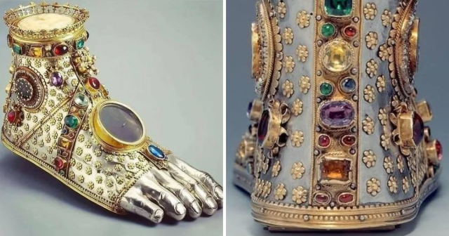 Сокровищница в виде стопы из Кафедрального собора Базеля, 1450 год. Реликварий, изготовленный из серебра, меди, золота, жемчуга, эмали, драгоценных камней и стекла.