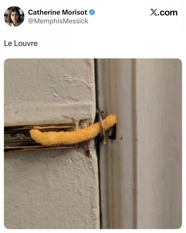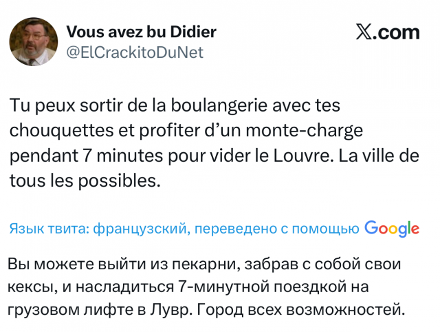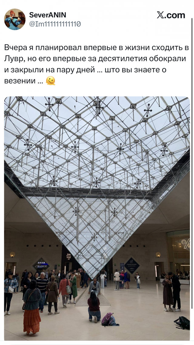Вы наверняка в курсе, что Лувр обнесли за 8 минут (по некоторым данным даже за 7!). Какое-то кино, а не французская полиция... И главное, в городе, где на каждом шагу камеры, преступников так и не нашли. Да они еще и корону выкинули... Один вор в законе посоветовал держать все это 5 лет у себя, а затем через посредника продать самому Лувру за 5 миллионов евро. А пока что лучшие шутки и мемы про ограбление Лувра.