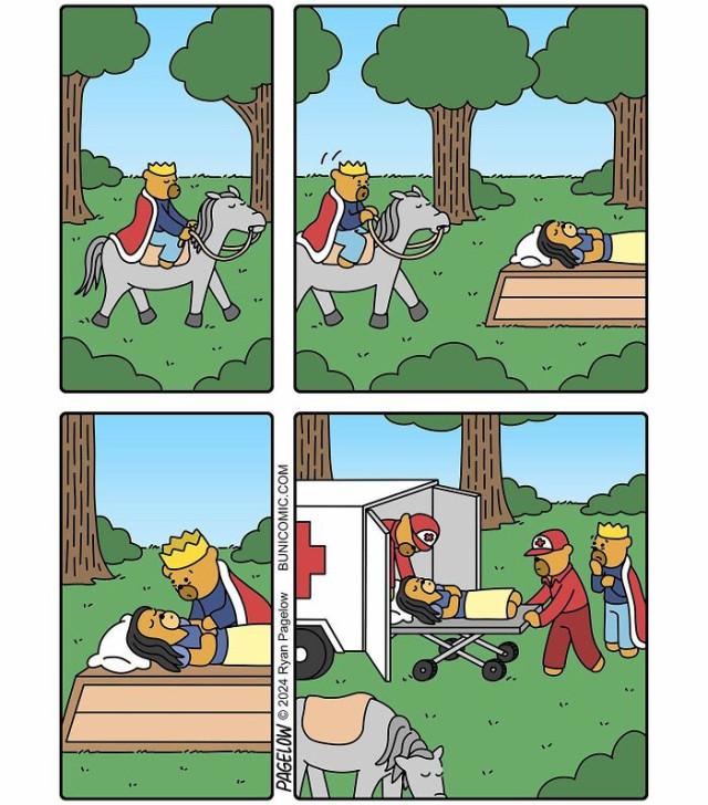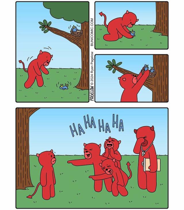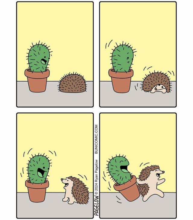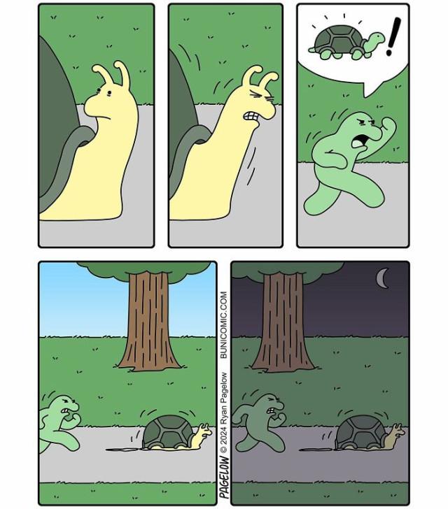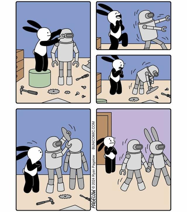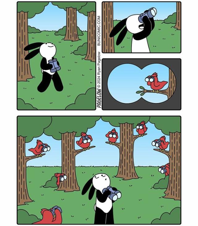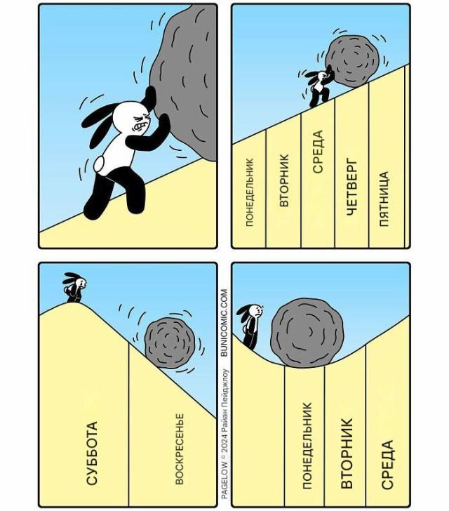 Яркий пример — комиксы Buni от художника Райана Пейджлоу (Ryan Pagelow). Его работы — это визуальный коктейль из розовых зайчиков, облаков и... жизненных тупиков. Если вы уже знакомы с его творчеством, вас снова ждёт порция абсурдной философии. Если же нет, то самое время открыть для себя его удивительный мир.