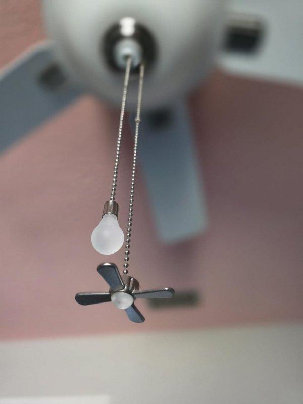 На цепочках потолочного вентилятора есть мини-модельки того, что они включают