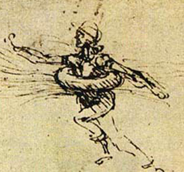 Эскиз Леонардо, на котором изображён вполне современный спасательный круг. Неясно, какие материалы он планировал использовать, но его явно привлекала тема безопасности в воде. «Наводнения превзойдут все другие разрушительные бедствия, - писал учёный. - Причиной их станут реки, выходящие из берегов»