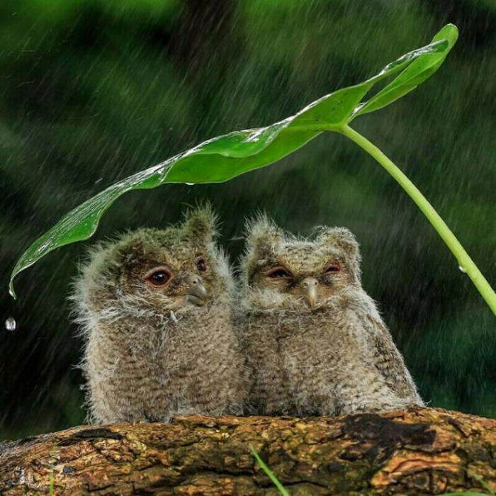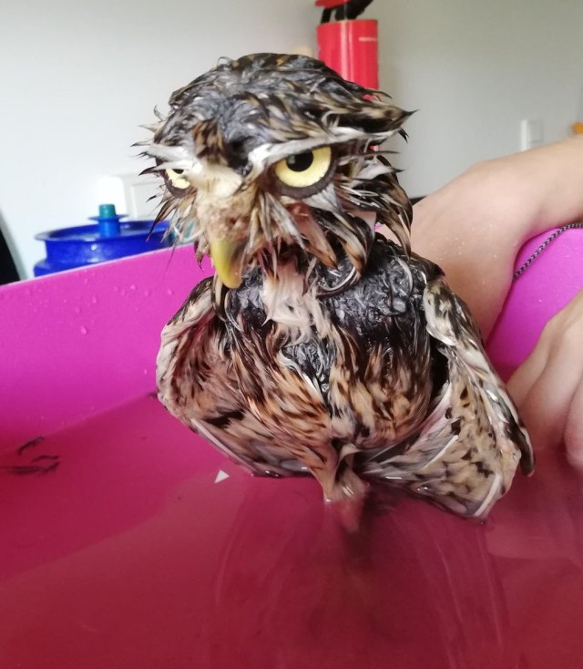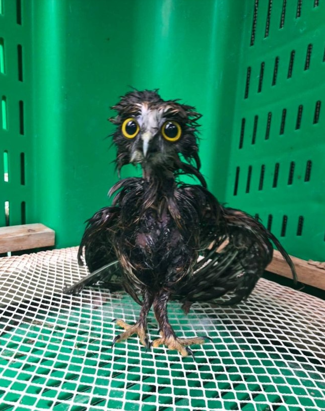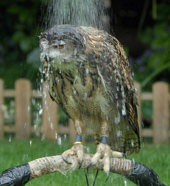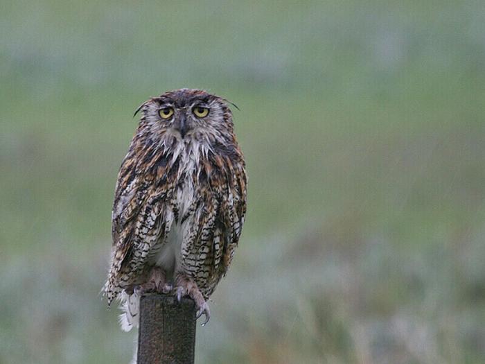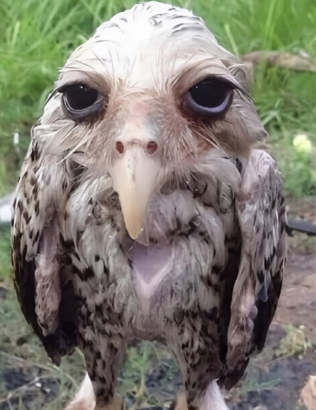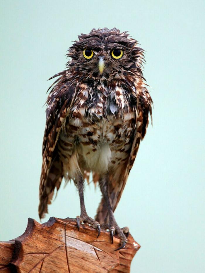Вот как выглядит сова, промокшая во время сильнейшего дождя: её перья отлично задерживают воду, становятся тяжелыми, и из-за этого птице становится трудно подниматься в воздух - она быстро устаёт.