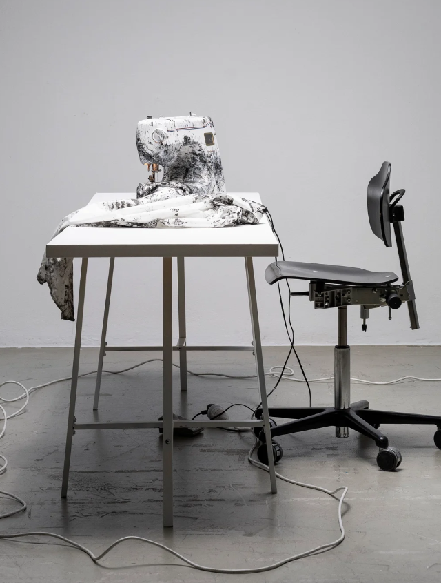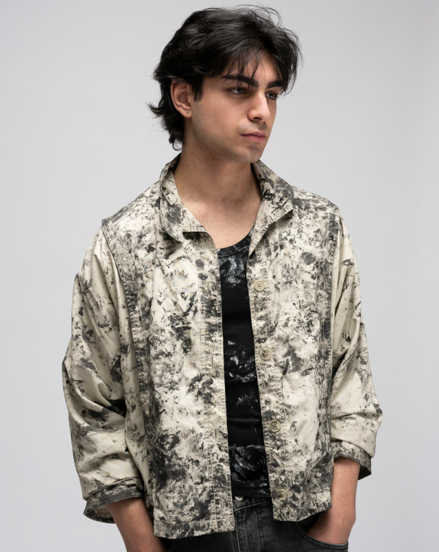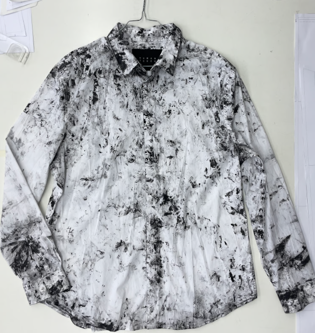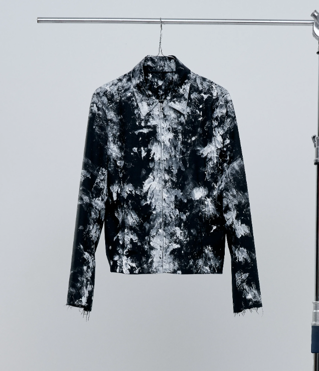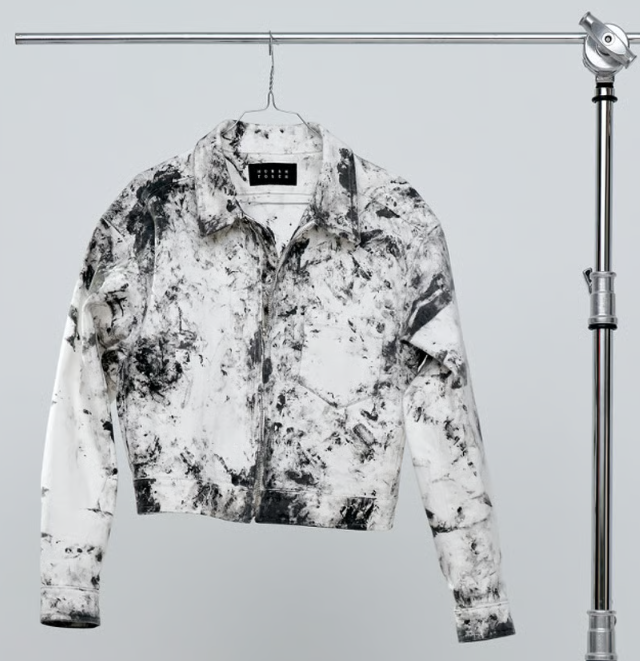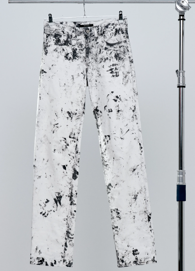 Чтобы уравновесить тяжелый принт, бренд использует читаемые, строгие силуэты. Рубашки с воротником, джинсы, пиджаки классического кроя, вещи с четко очерченными и узнаваемыми деталями. Затем текстильная краска закрепляется на волокнах, делая одежду пригодной для носки и стирки. Эта необычная техника соединяет дизайн, искусство и активизм, наглядно проявляя невидимый ручной труд.