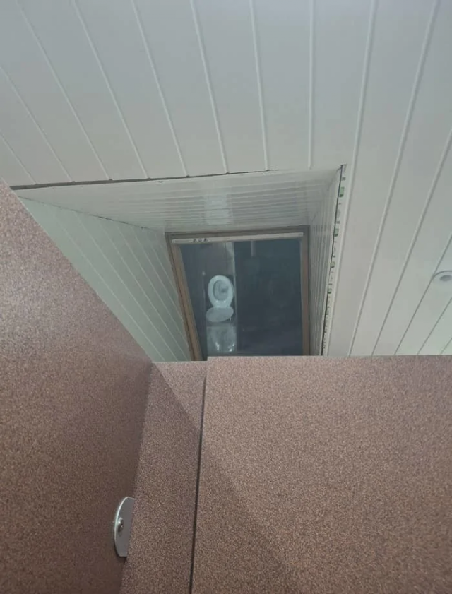 Туалет с мансардным окном, в котором отражаются соседние кабинки